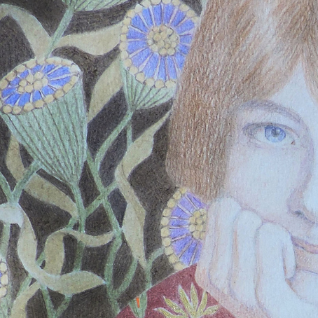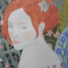 At the center of the composition is a female figure with red hair neatly styled. Her face is rendered in a delicate, light manner, with a slight blush and gently squinting pale blue eyes looking to the side, expressing pensiveness or shyness. In her hair, she has pinned a single light, elegant flower.