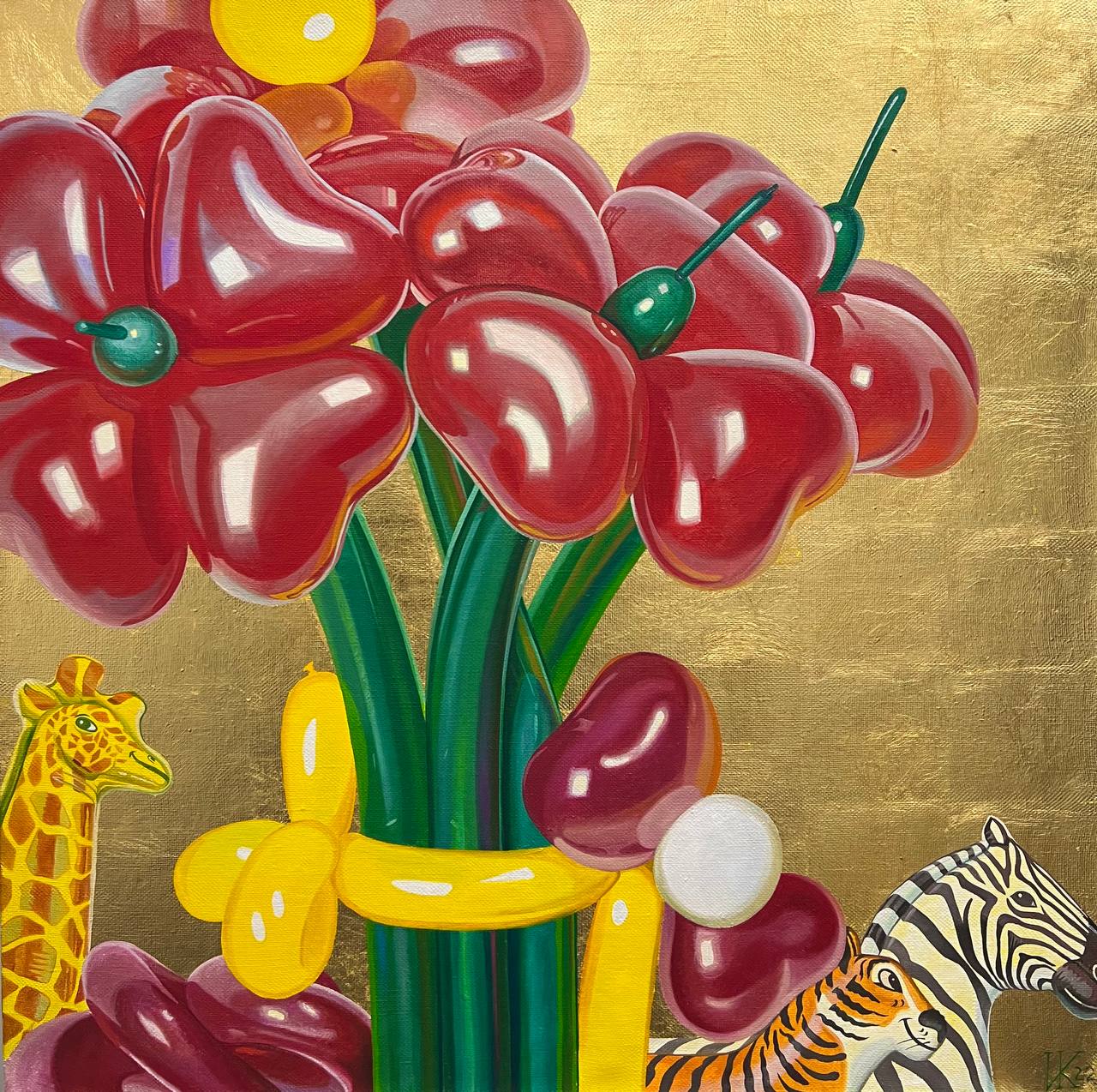 At the center of attention of the painting is a bouquet of flowers, executed in bright red and yellow tones. The flowers, stylized as balloons, create a feeling of celebration and fun. Their bright, saturated color attracts attention and brings a smile. The flowers seem to symbolize the beauty and refinement that can be found even in the world of wildlife.