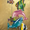 At the center of attention of the painting is a group of sea fish soaring in the air on thin threads or fishing lines, like balloons. The artist depicts various representatives of marine fauna: a clownfish, an angelfish, a dolphin, and a shark. Their bright plumage, executed in various colors and patterns, creates a feeling of celebration and fun. The fish, like toys, attract attention and bring a smile.