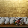 At the center of attention of the painting is the foreground, in which white chicken eggs are closely arranged to each other. They occupy most of the composition, creating a sense of homogeneity and monotony. The eggs, like symbols of potential life, at the same time look faceless and identical, which emphasizes the theme of conformism and the absence of individuality. Their whiteness, pure and untouched, seems cold and detached.