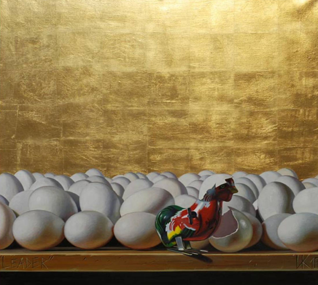 Ivan Korshunov’s painting “6. Leader” is a laconic and deeply symbolic composition in which the artist explores the theme of leadership, individuality, and opposition to conformism. He uses minimalistic means of expression and contrasting colors to create an atmosphere of tension, reflection, and hidden irony characteristic of a modern view of the phenomenon of power and leadership. It is not just a still life depicting eggs and a rooster, but a kind of visual parable about how difficult it is to preserve one’s individuality in a world dominated by mass character and uniformity.