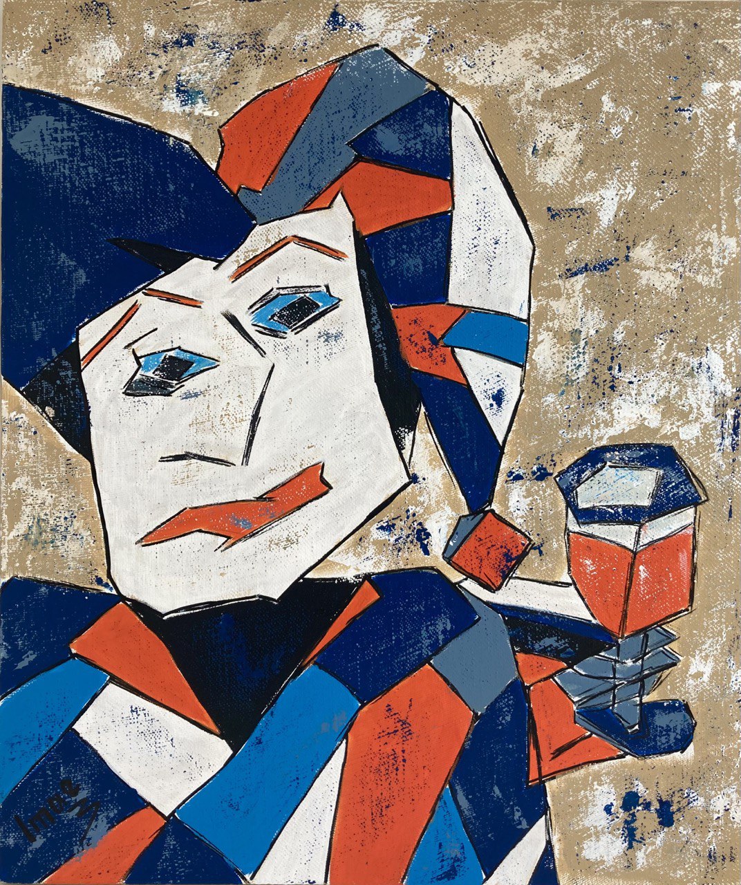 In this portrayal of Harlequin, irony and mystery intertwine. His gaze is like an invitation to a game, where a glass of wine symbolizes not a celebration, but the theater of life. The geometry of forms, the vivid contrast of red and blue, and the texture of the background create a tension that draws the eye. This work is for collectors who appreciate the irony of art and the power of the avant-garde.