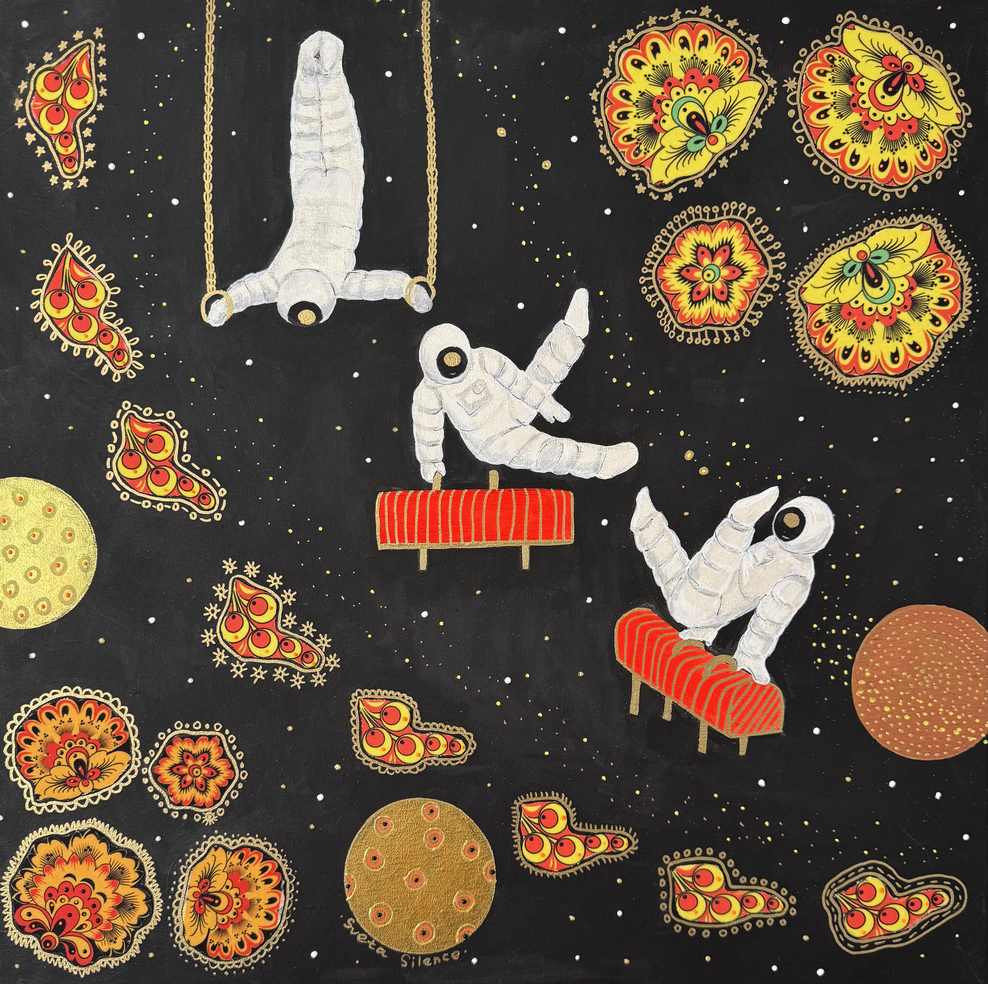 Positive-patriotic fantasies about space. Author's technique: canvas, acrylic, textile, 2025
