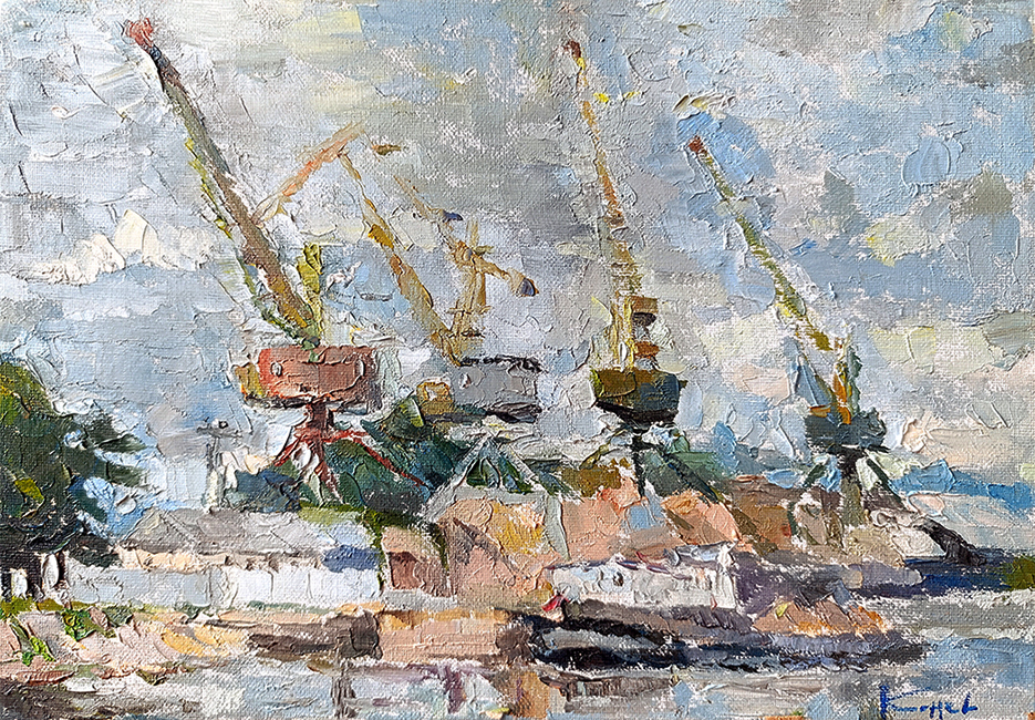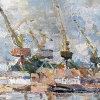 Картина Федора Конева «Старые краны в речном порту» — это динамичный индустриальный пейзаж, написанный в свободной, фактурной манере, характерной для художника.