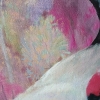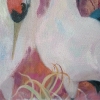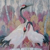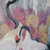 На картине изображены два журавля, стоящие на фоне осеннего леса. Их белые перья контрастируют с яркими красками природы: розовыми, желтыми и зелеными оттенками листвы. Один из журавлей слегка наклонил голову, создавая ощущение взаимодействия между птицами.