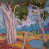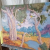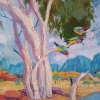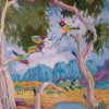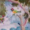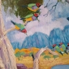 The painting is done in a delicate color palette. It depicts the nature of Australia and the elegant finches known as amadinas. Seven amadinas, like seven notes, are meant to sing the beauty and uniqueness of their native land.