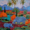 The painting «In the Blue Valley» by Irina Moskaleva is done in the post-impressionist style and conveys an atmosphere of tranquility and harmony with nature. In the foreground, two rhinoceroses are depicted, harmoniously blending into the surrounding landscape. Their figures are rendered in soft blue tones, creating a sense of lightness and airiness.