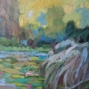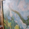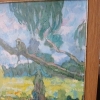 The painting technique is characterized by softness and lyricism. The artist uses smooth, broad strokes to create a feeling of lightness and airiness. The color palette mainly consists of muted shades of green, blue, and brown, enhancing the sense of calm and serenity.