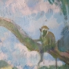 At the top of the painting, on a tree branch, sits a small monkey seemingly observing life in the lagoon. Its presence adds a humorous touch and brings dynamism to the scene.