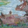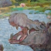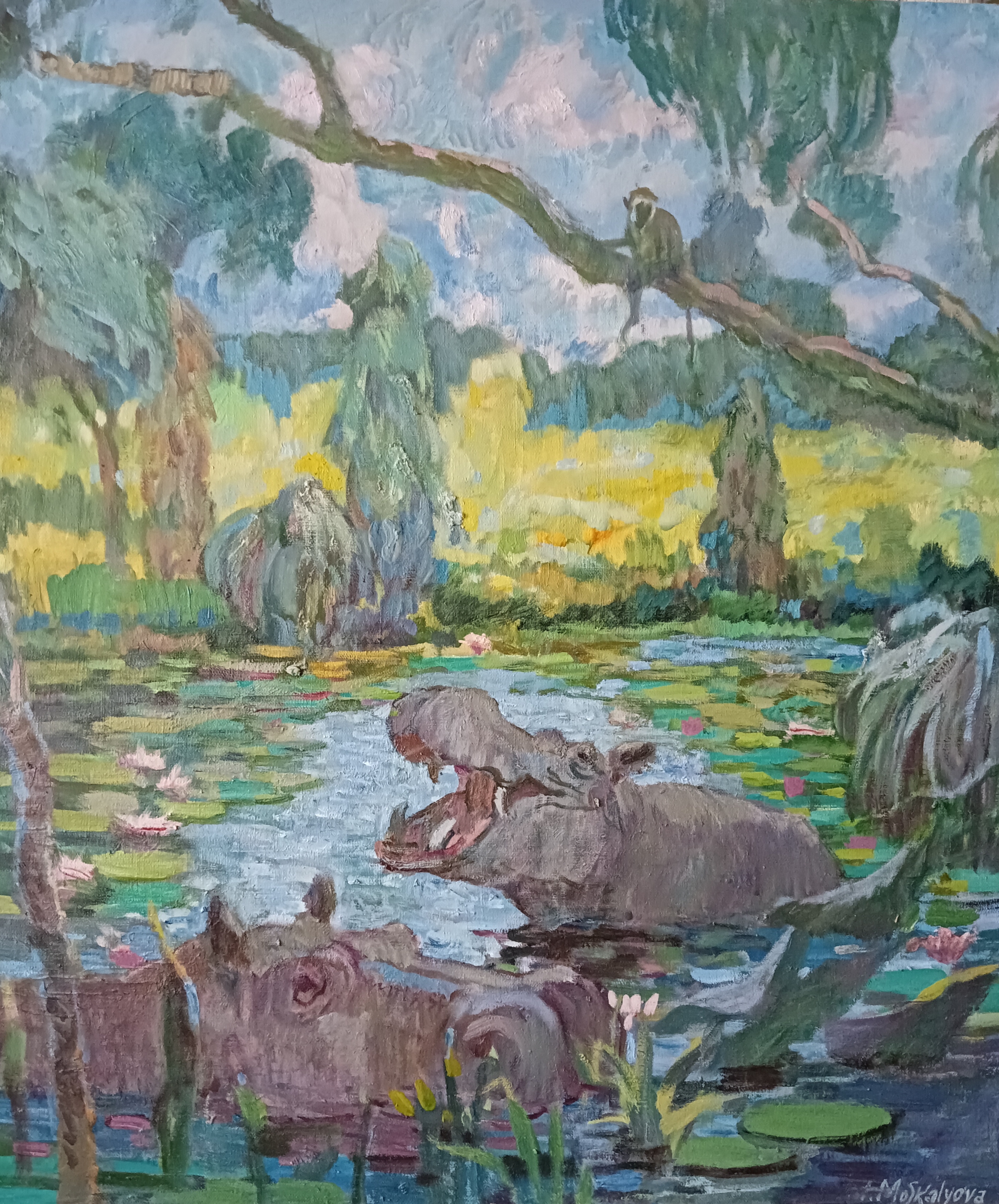The focus is on a pair of hippos leisurely splashing in the water. Moskaleva lovingly depicts their massive bodies and distinctive features, such as their wide snouts and small ears. One hippo, in the foreground, is shown with its mouth open, revealing its enormous teeth. The other, slightly further back, is calmly submerged in the water, with only its head visible.
