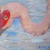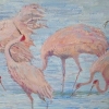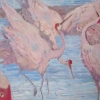 The focus is on a group of cranes standing in shallow water. Moskaleva masterfully captures their elegant poses and graceful movements. Some stand with their heads lowered into the water searching for food, others preen their feathers, and some take flight, spreading their wings. The cranes are depicted in soft shades of pink and gray, creating a feeling of lightness and airiness.