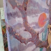 The sky is rendered in pastel shades of lilac and blue, with a round pink sun or moon peeking through a light haze, creating a sense of unreality. In the lower left corner of the painting, unusual plants with pink flowers add a decorative touch to the composition.
