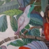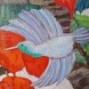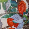 The orange color of the physalis fruits dominates the composition, creating a bright and joyful accent. It contrasts with the cool tones of the greenery and the bluish shades of the birds' plumage. This color contrast gives the image liveliness and dynamism.