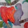 The birds depicted on the branches are rendered in various shades of gray, blue, and turquoise. Their poses and arrangement create a sense of movement and life. It seems as if they have just arrived to feast on the juicy physalis fruits or to sing their morning song.