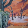 Warm shades of ochre, terracotta, and rich orange dominate, coloring the hills and horizon. This hot background strikingly contrasts with the cool blue-green tones of the whimsical plants in the foreground. Massive cacti and a strange, almost alien flower with a lilac-pink center stand out here.