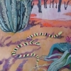 The landscape is enlivened by a snake with a bright zigzag pattern slithering on the ground. A tiny turquoise bird perches on one of the cacti, adding dynamism to the composition. The dry, gnarled trees in the background emphasize the harshness of the desert landscape.