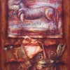 The overall coloring is done in warm brown-golden shades, which gives the painting a vintage and noble look. The contrast between the upper part with the image of a horse and the lower still life creates the effect of a dialogue between eras, combining ancient symbolism and the materiality of things.