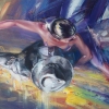 The use of bright, saturated shades - lilac, blue, gold - creates a sense of movement and energy. Sweeping brushstrokes give the work expression and depth. The man, partially hidden by the play of light and shadow, restrains his passion, and his lowered hat becomes an accent of the composition.