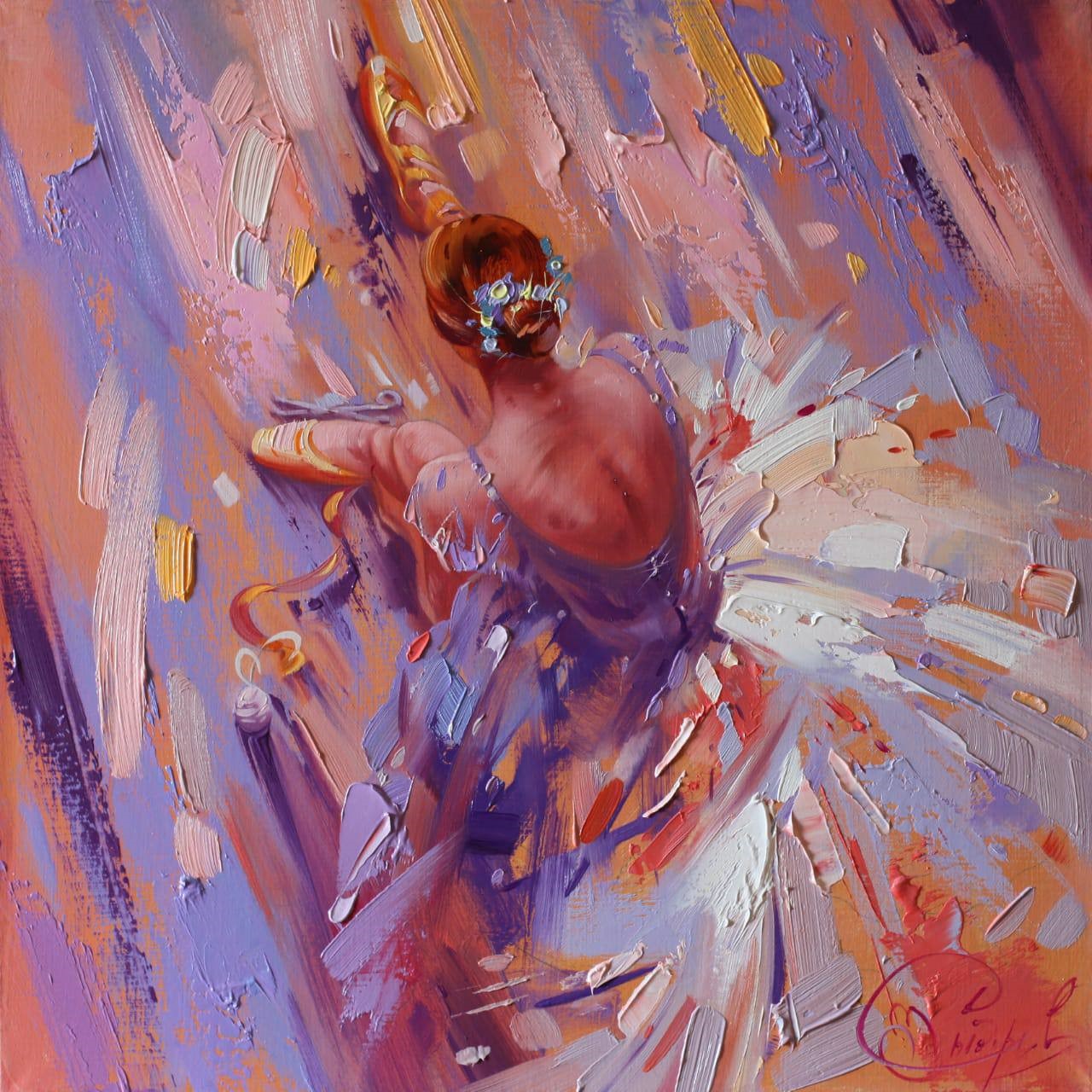 The artist uses expressive brushstrokes, rich shades of purple, pink and gold, creating dynamism and a sense of movement. Her dress, made with light and bold brushstrokes, seems to dissolve in space, emphasizing the lightness and airiness.
