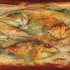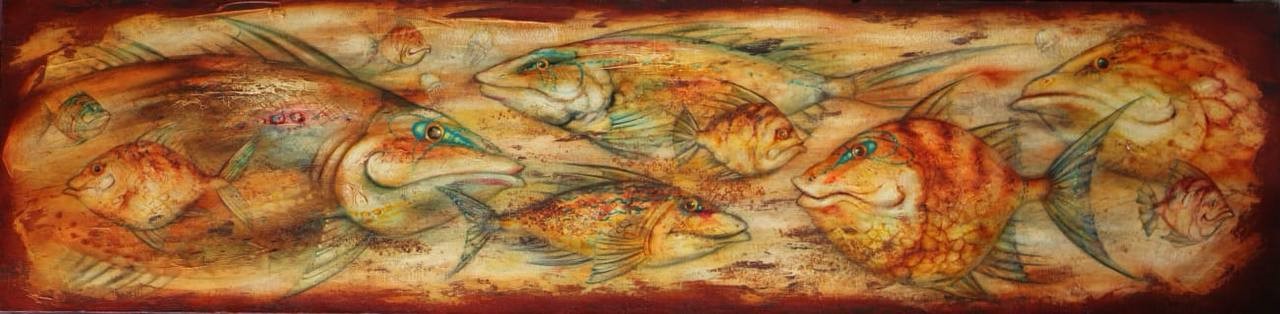This painting depicts an underwater world filled with movement and life. The composition is built around a group of expressive fish, each of which looks unique thanks to carefully drawn details and intense colors. Warm shades of orange, gold and brown create the effect of an old canvas, and veins of turquoise and blue give the work depth and dynamism.