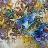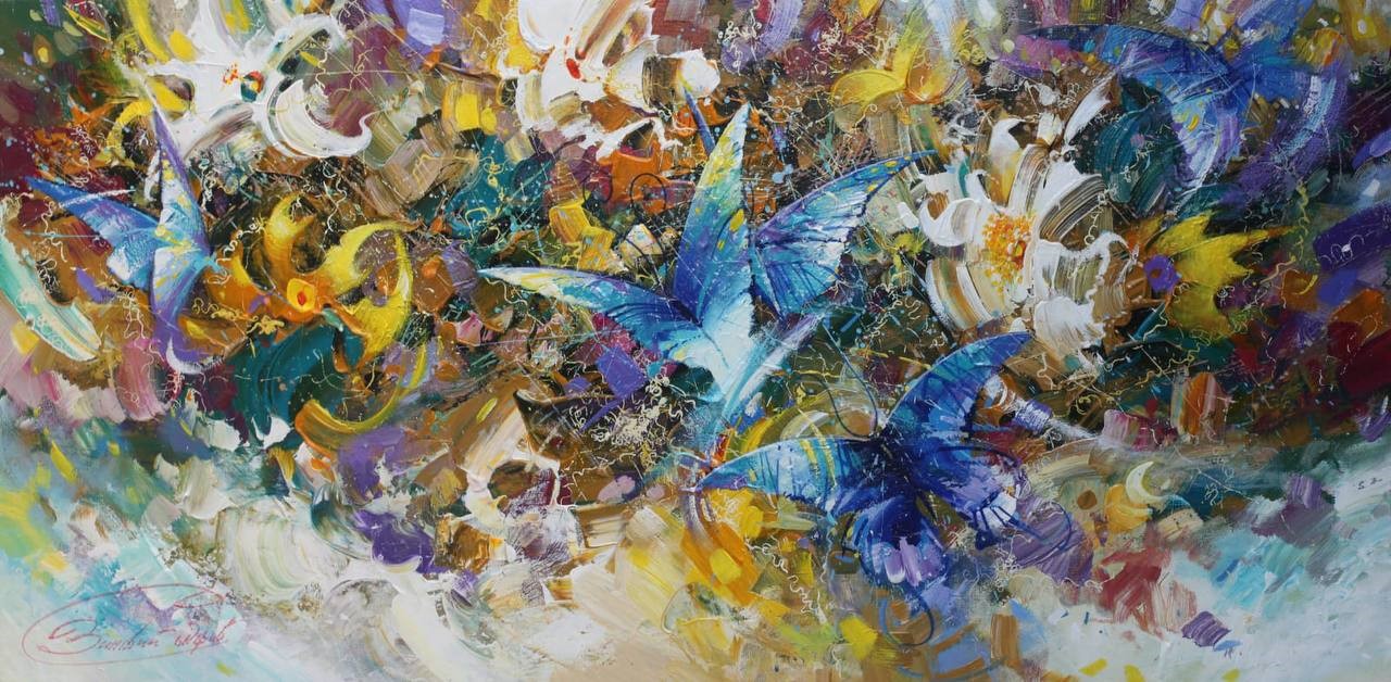 The painting is filled with dynamics and bright colors, creating a feeling of movement and lightness. In the center of the composition are blue butterflies, attracting attention with their rich shades and smooth lines of wings. They seem to hover over a flower field, surrounded by a whirlwind of white, yellow and purple flowers. The use of impasto brushstrokes and chaotically intertwined lines gives the image liveliness and expression.
