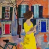 In the foreground is a woman in a bright yellow dress, which makes her stand out against the more muted tones of the street. Her image radiates calm and peace, she holds a bird in her hands, which symbolizes care, nature or inner harmony. Her face is turned to the side, as if she is thinking or her attention is drawn to something out of the viewer's field of vision.