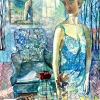 This painting depicts a woman in a light blue patterned dress, filled with calm and light. Her pose and gaze, softly turned to the side, create an atmosphere of reflection or observation. Blue and turquoise tones emphasize the feeling of morning freshness or a spring day.