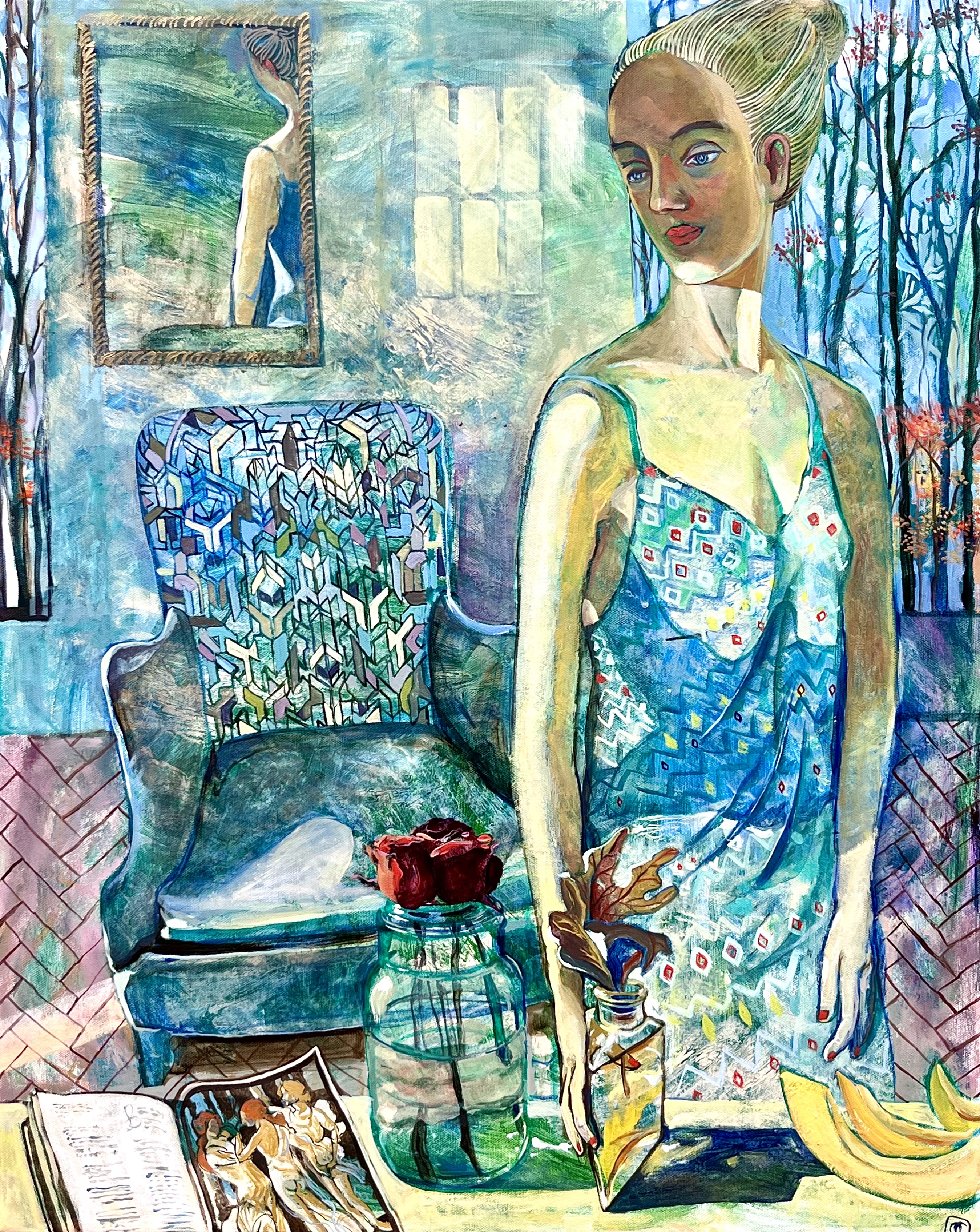 A wonderful background is an armchair with a geometric pattern and a mirror reflecting the figure of the woman. The window behind her and the trees outside accentuate the character of the daylight, playing on the soft lines of the image. The painting conveys a quiet but meaningful atmosphere in which nature, art and a dreamy state of mind are intertwined.