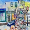 Particular attention is drawn to the richness of the colors and the attention to detail, be it the flowers in a vase in the corner of the composition or the textures of the buildings. The painting feels both personal and public: the urban landscape acts as a backdrop for the heroine, who seems to be in her own world. This contrast gives the work depth and a symbolic dimension, emphasizing the unique place of man in the hustle and bustle of everyday life.