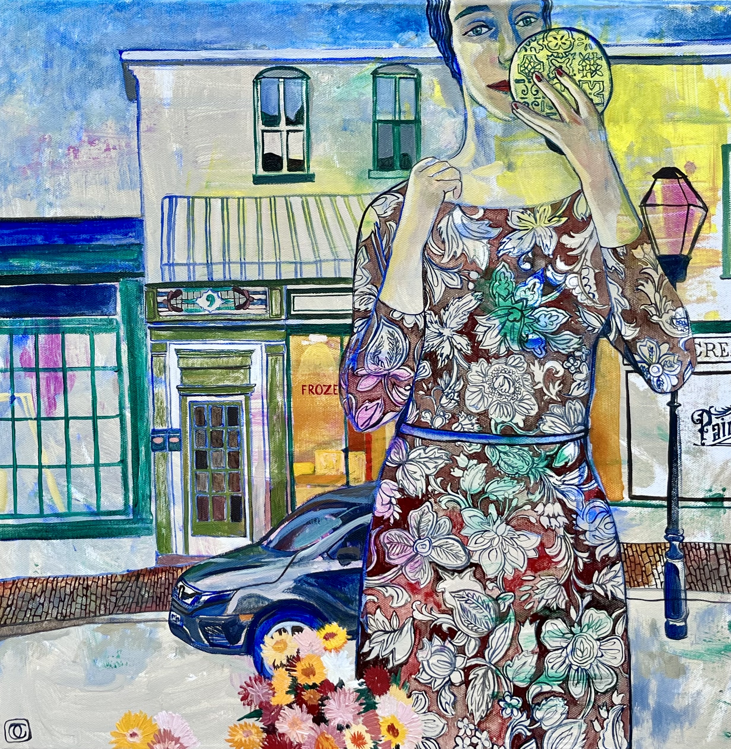 This painting is filled with vibrant colors and the dynamism of modern urban life, harmoniously combined with elements of individuality and personal expression. In the foreground, a woman is depicted holding a decorative object reminiscent of a mirror or a plate with a bright pattern, adding mystery to her image. Her dress, covered in an intricate floral pattern, combines an aesthetic accent with natural motifs.