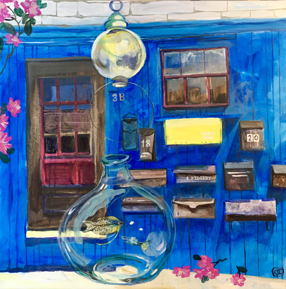 This artwork combines surreal and realistic elements, creating an enchanting, dreamlike narrative. The vibrant blue facade of a building serves as the backdrop, with intricate details like red-paned windows and multiple letterboxes—each with distinct markings, suggesting stories of the occupants or histories of their use. The composition draws the viewer in with its vibrancy and texture.