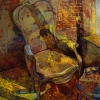 This painting with a warm, sunny palette and vintage aesthetic creates a cozy, almost nostalgic atmosphere. In the foreground is an antique chair with graceful curves and carved elements. It seems to be the center of attention, drawing the eye with the play of light and shadow. The golden-brown tones enhance the feeling of warmth and coziness, making the image lively and realistic.