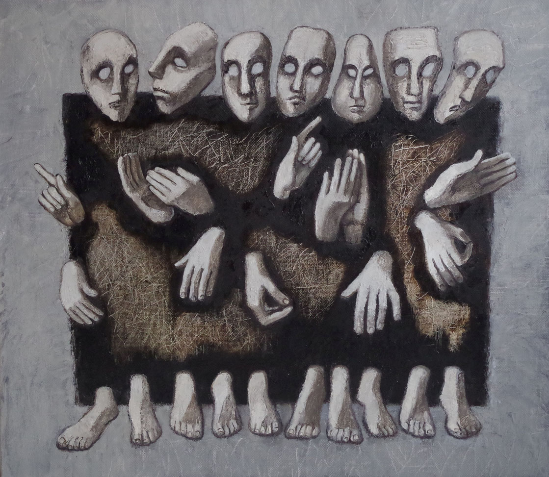 Сама композиция картины построена таким образом, что фигуры словно выходят из тёмной, хаотичной массы, которая может символизировать коллективное бессознательное, социальные нормы или просто некий общий фон, объединяющий всех людей. Руки, отделившиеся от тел, кажутся самостоятельными: они жестикулируют, молятся, указывают, выражая широкий спектр человеческих действий и состояний, но при этом не всегда связаны с лицами, что подчёркивает разобщённость и внутреннее одиночество.