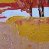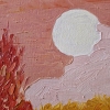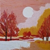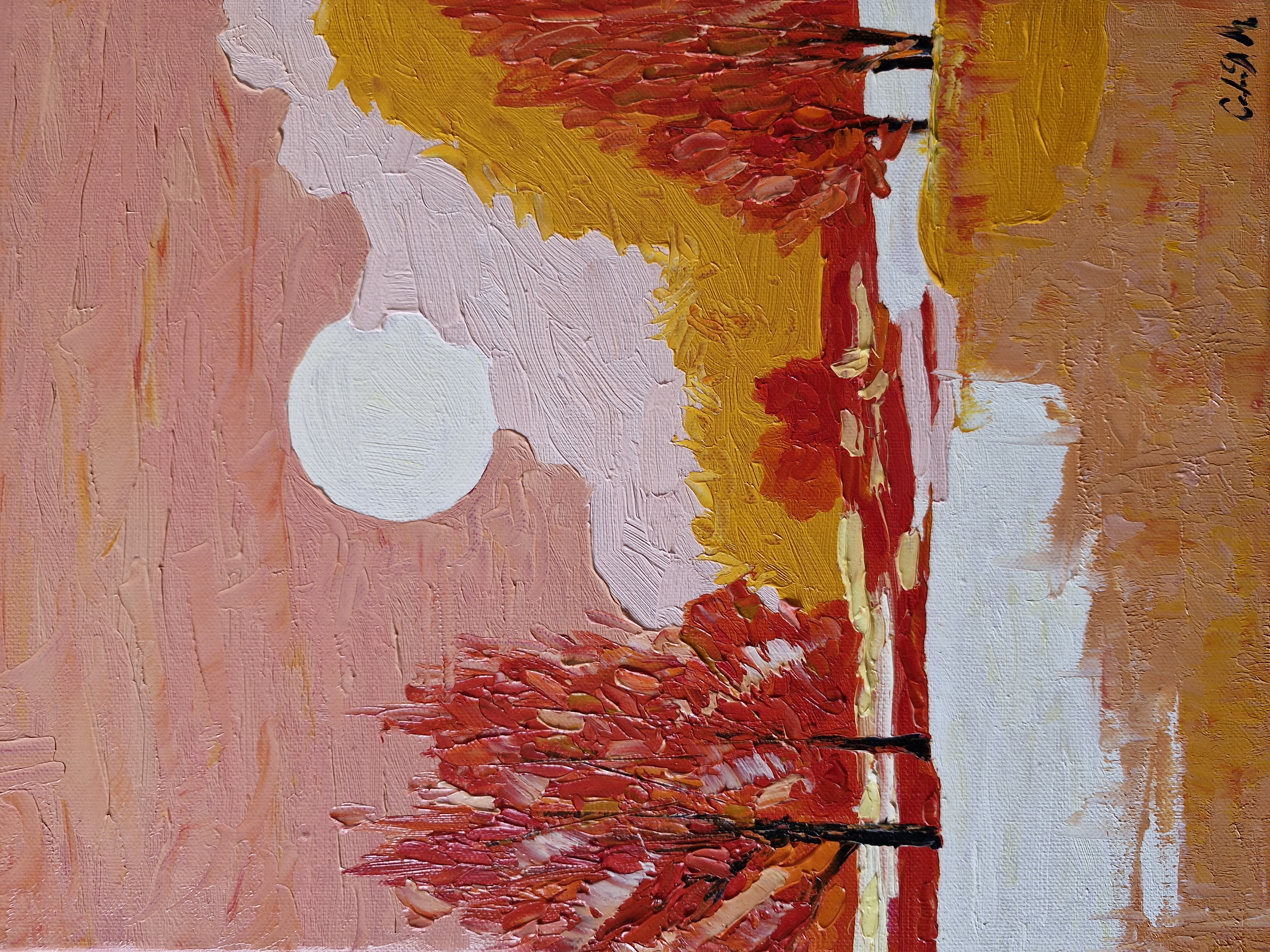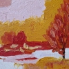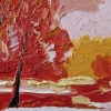 This oil painting on canvas depicts an autumn landscape filled with warmth and harmony. The rich red and orange hues capture the beauty of autumn nature. The trees with their vibrant leaves create a sense of coziness and tranquility, while the pond adds depth and balance to the composition.