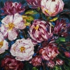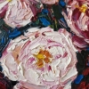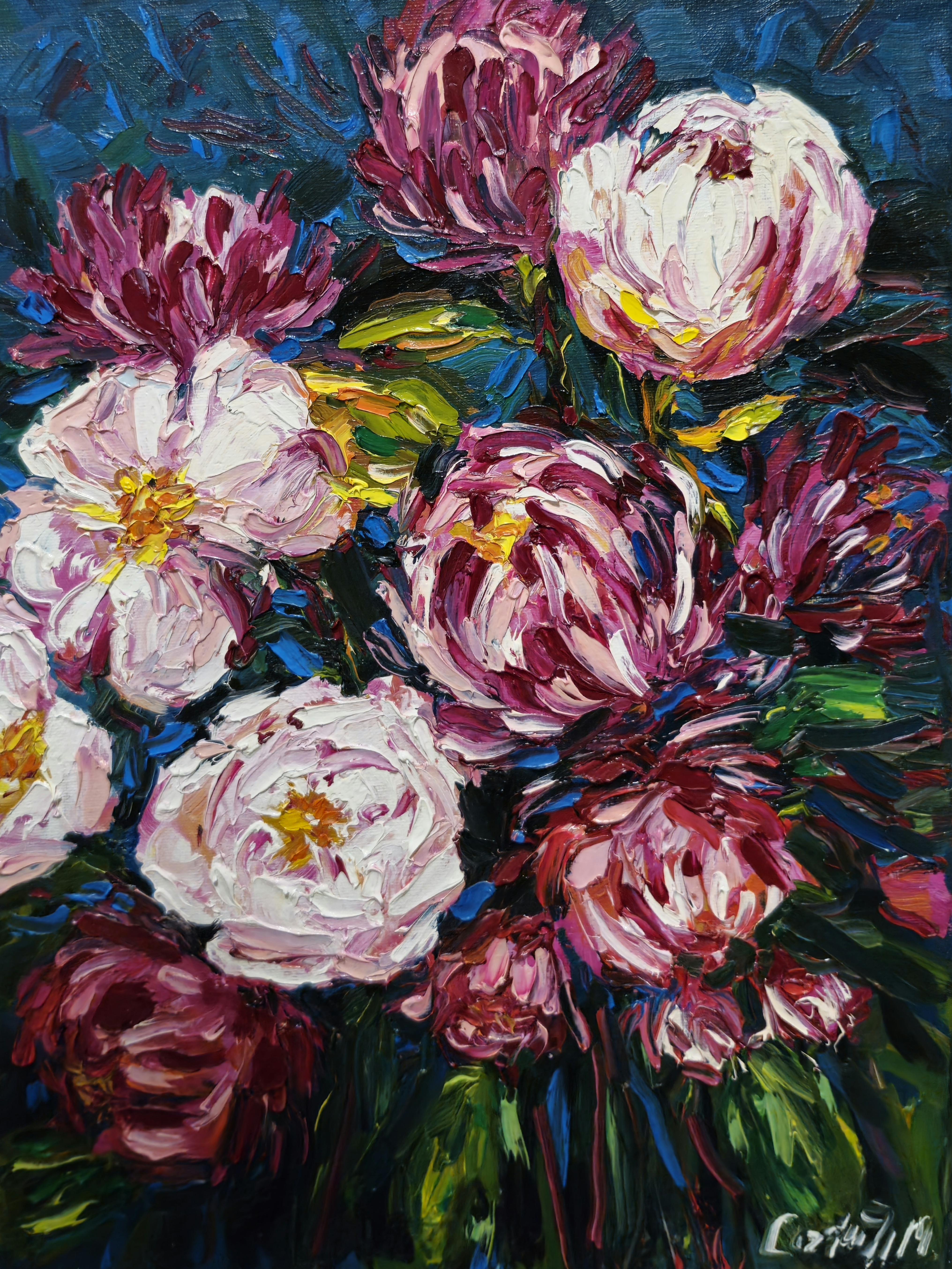 This oil painting on canvas depicts a bouquet of peonies, made in a bright and rich color scheme. The impasto technique is used, thick strokes of paint are applied, which gives the work volume and texture.
