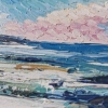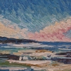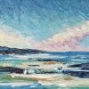 In the image, we see a seascape with a sunset, where the sky and sea are depicted using rich shades of blue, pink, and ocher.