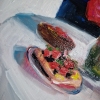 В центре композиции — круглый стол, накрытый белоснежной скатертью. На нём сервирован лёгкий завтрак: аппетитный тарт с ягодами, кусочек пирога и чашка с напитком, возможно, чаем или кофе. София мастерски передаёт текстуру еды, делая её манящей и аппетитной. Яркие ягоды на тарталетке и блестящая глазурь на пироге добавляют живости и привлекательности.
