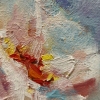 Фон картины, выполненный в мягких оттенках голубого, сиреневого и белого цветов, имитирует игру света и тени в солнечном пространстве. Эти мазки фона не статичны, они перекликаются с формой лепестков, усиливая общее ощущение свежести и лёгкости.