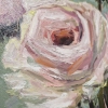 Фон картины, выполненный в приглушённых бирюзово-зелёных тонах, служит идеальным контрастом для нежных лепестков. Художница использует лёгкие, полупрозрачные мазки, создавая эффект рассеянного света, словно сквозь лёгкую дымку. Это придаёт композиции глубину и воздушность, позволяя цветам розы сиять ещё ярче.