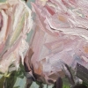 С первых мгновений взгляд приковывает центральная роза, раскрывающая свои бархатистые лепестки. Её сердцевина, наполненная тёплым светом, переходит от нежного кремового оттенка к лёгким розоватым переливам. Мазки кисти Софии объёмны и выразительны, они передают каждую прожилку, каждый изгиб лепестка, создавая ощущение живой текстуры.