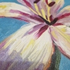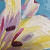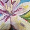 В центре композиции — крупный раскрывшийся цветок лилии. Его лепестки, написанные в технике импасто, поражают своей нежностью и объёмом. Сочетание белого, бледно-жёлтого и нежно-розового оттенков создаёт ощущение лёгкости и воздушности. Лепестки словно колышутся на ветру, передавая движение и живость. Середина цветка с пыльцой написана более насыщенными золотисто-оранжевыми тонами, что придаёт ей яркость и глубину.