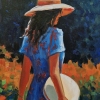 В центре композиции — молодая женщина, образ которой окутан летним теплом. Она одета в яркое синее платье с цветочным узором, которое прекрасно сочетается с окружающей природой. Соломенная шляпа с широкими полями защищает от солнца и придаёт образу утончённость. Женщина стоит спиной к зрителю, её взгляд устремлён вдаль, словно она наслаждается красотой парка, впитывая его атмосферу.