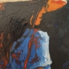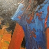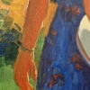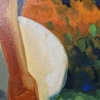Окружающий пейзаж написан сочными, яркими мазками. Оранжевые и жёлтые пятна, напоминающие цветы или опавшие листья, создают ощущение солнечного света, пробивающегося сквозь листву. Зелёные оттенки листвы и травы придают картине свежесть и естественность. Глубокий тёмно-синий фон, возможно, символизирует тени от деревьев или вечернее небо, придавая картине глубину и загадочность.