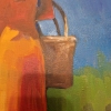 Девушка находится в саду, среди деревьев, усыпанных оранжевыми плодами, возможно, апельсинами или мандаринами. Её рука, протянутая к одному из фруктов, намекает на процесс сбора урожая, на близость к природе и её дарам. В другой руке она держит корзину, возможно, собираясь наполнить её спелыми плодами. Её поза, лёгкая и непринуждённая, передаёт ощущение комфорта и гармонии с окружающим миром.