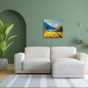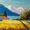 The painting «Mountain houses» by Sofia is a dazzling tribute to nature, where the grandeur of the mountains meets the quiet coziness of human life. The canvas is filled with incredible color energy: golden fields in the foreground sharply contrast with the cool blue of the mountain slopes and the dazzling white snowy peaks.