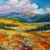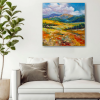 The artist uses an energetic, impasto painting technique. Each brushstroke works to create volume and movement, making the canvas «vibrate» under the influence of light. The rich palette — from ochre and orange earth tones to deep azure shades of the sky and mountains — creates a feeling of fullness of life. Clouds, painted with light and quick brush touches, add dynamics and airiness to the painting.
