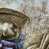 Textured paste, oil and acrylic paints, wax, and bitumen varnish emphasize the contrast of textures: the patina of metal, the juiciness of fruit, the roughness of the fresco.