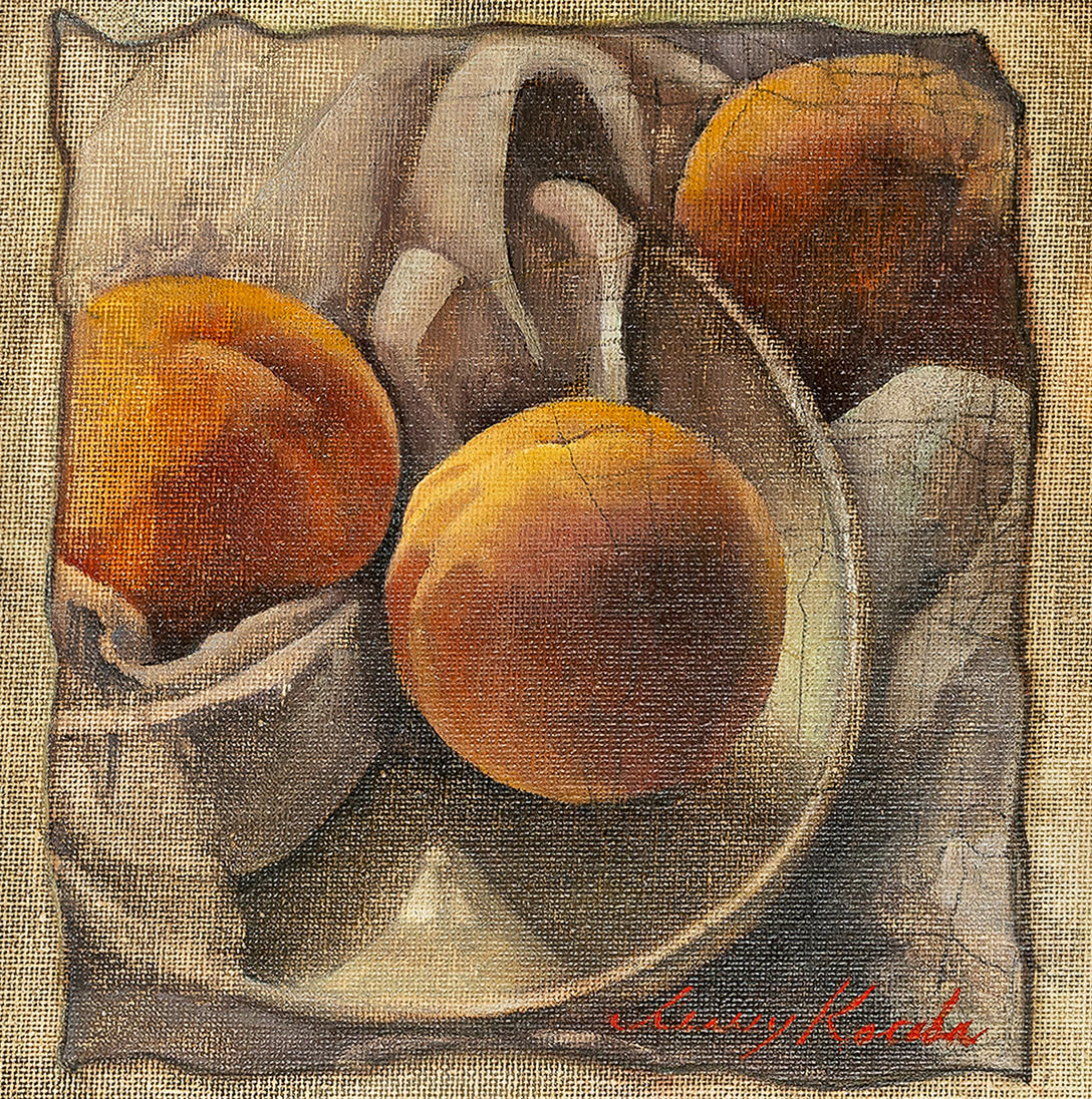 “Aroma of Freshness” is a work filled with inner radiance. Three peaches, frozen on the canvas, seem to glow from within. Their velvety dark orange skin breathes freshness, exuding a sweet aroma. The background, executed in the thinnest layers, is rubbed down to the base in places, creating the image of an ancient fresco. This technique emphasizes the passage of time, which gradually transforms the juicy flesh into nothing more than a memory of a hot summer.