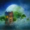 The painting depicts a fantastic house floating in the clouds under the majestic glow of a huge green moon. A cozy house with warm light in the windows is surrounded by tree crowns, the leaves of which smoothly swirl in the misty atmosphere. On the roof there are shadows of cats, which seem to guard this place. The painting fascinates with its magical atmosphere, mixing elements of reality and sleep. Bright colors and soft contours create a feeling of peace and magic, inviting you to plunge into a world of fantasy and mystery.