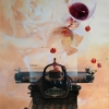 A glass of red wine floats peacefully above, a symbol of relaxation, enjoying the moment. The wine seems to spill, adding a sense of movement and life. The theme of delicacies is played out nearby - cheese, as well as fresh bright red cherries, which with their ripeness and shine give the scene a note of sweet seduction.